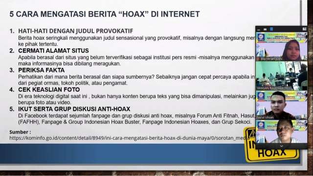 Nurul Ichsan selaku tutor memaparkan materi mengenai dampak positif dan negatif penggunaan internet. Terutama penyebaran Konten atau Berita Bohong di Internet. Dalam hal ini Ichsan memberikan tips tentang cara mengecek keaslian sebuah berita. Diantaranya Mewaspadai Judul-judul berita yang provokatif, Mencermati alamat situs Web, selalu mengecek info Gambar yang tersebar, dan mengikuti informasi terbaru dengan mengkases situs official guna menghindari konten bohong/hoaks.