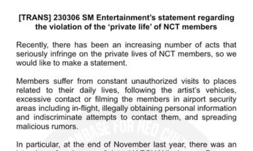 “Para anggota menderita karena kunjungan tanpa izin yang terus-menerus ke tempat tinggal anggota NCT, mengikuti kendaraan mereka, melakukan kontak berlebihan serta mendapat informasi pribadi anggota secara ilegal,” jelas SM.
