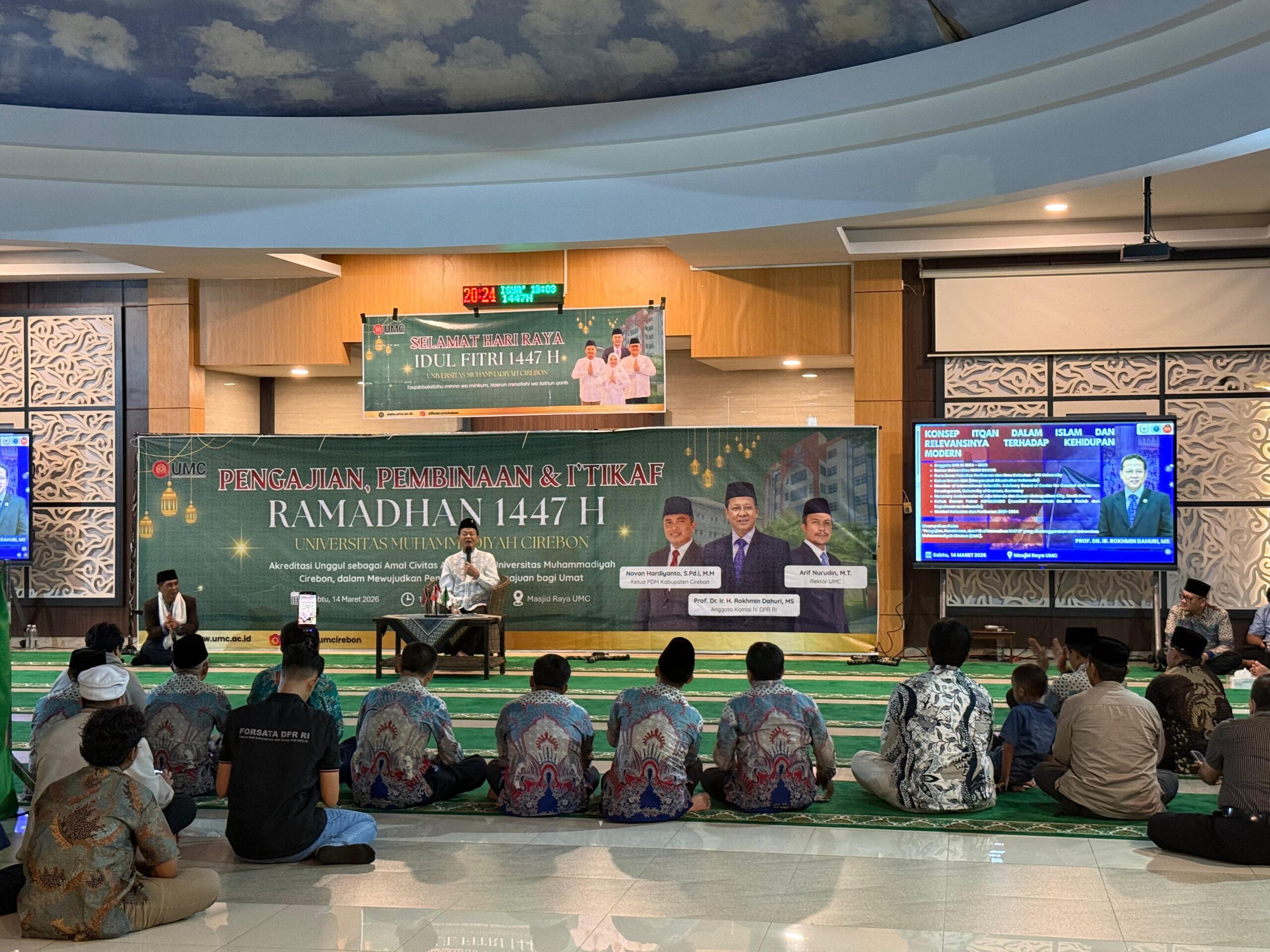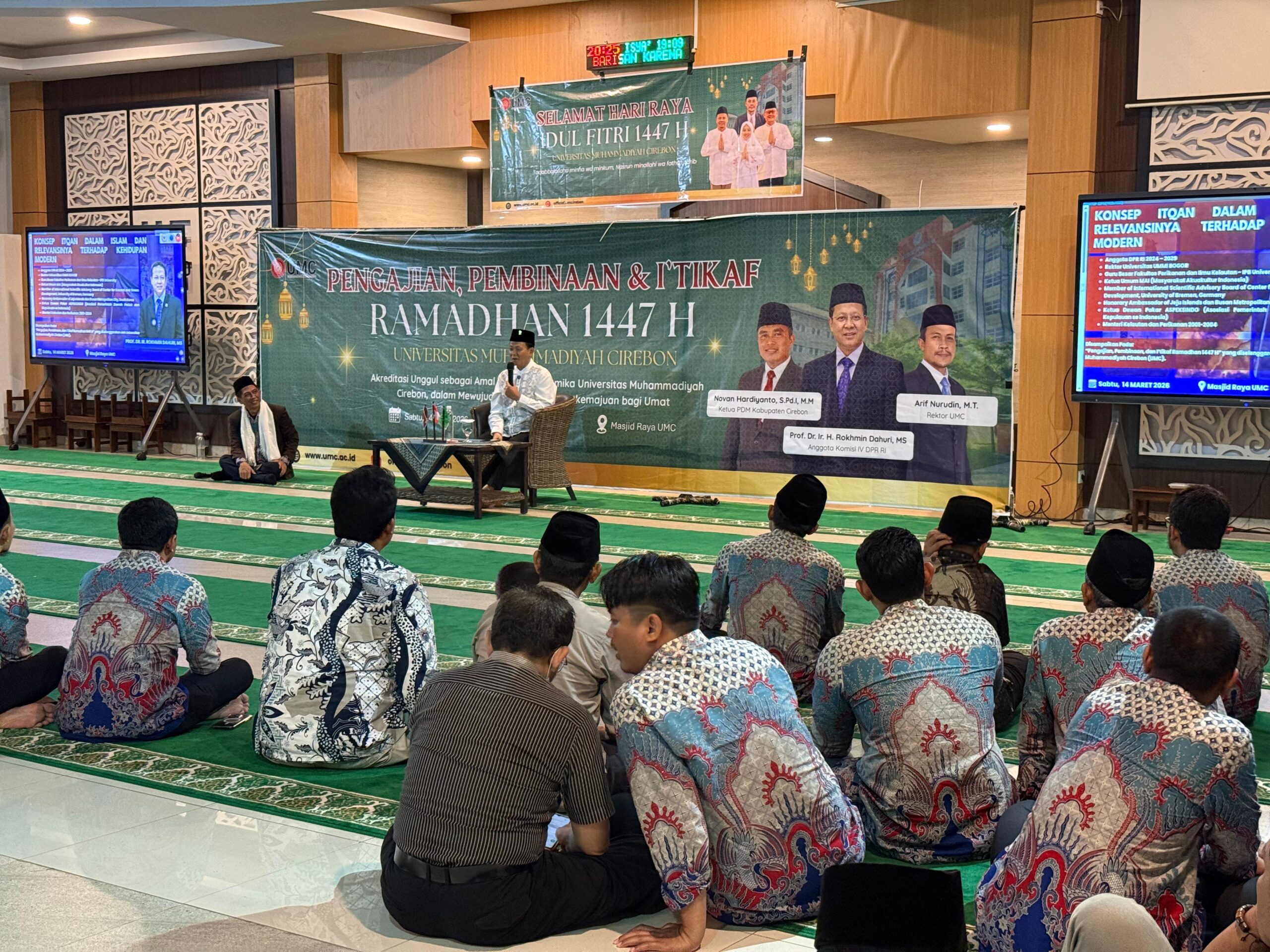“Dalam kehidupan modern, itqan berperan sebagai landasan etika profesional yang mendorong setiap pekerjaan dilakukan secara teliti dan berorientasi pada kualitas terbaik. Itqan juga menjadi dasar pembentukan budaya kerja yang akuntabel, di mana setiap tugas dikelola secara sistematis, transparan, dan dapat dipertanggungjawabkan,” kata Prof. Rokhmin Dahuri saat mengisi “Pengajian, Pembinaan, dan I’tikaf Ramadhan 1447 H” yang diselenggarakan oleh Universitas Muhammadiyah Cirebon (UMC), di Masjid Raya UMC, Sabtu, 14 Maret 2026.