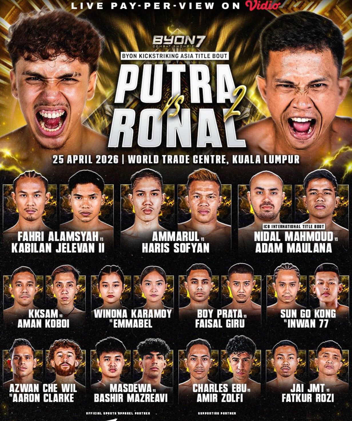 Acara ini menghadirkan berbagai laga, dari boxing hingga kickstriking, termasuk perebutan gelar seperti ICB International Belt dan Byon Kickstriking Asia Title.