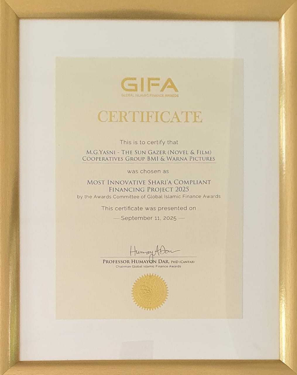 Milenianews.com, Kuala Lumpur– Ajang bergengsi Global Islamic Finance Awards (GIFA) 2025 kembali mencatatkan prestasi membanggakan bagi Indonesia. Tahun ini, GIFA menganugerahkan penghargaan Most Innovative Shari’a Compliant Financing Project 2025 kepada film The Sun Gazer, dalam sebuah acara yang digelar di Kuala Lumpur, Malaysia, Kamis, 11 September 2025. Film tesebut diangkat berdasarkan kisah nyata dan novel berjudul serupa karya Muhammad Gunawan Yasni (MGY), yang dieksekutifproduseri oleh Kamaruddin Batubara atas nama Koperasi BMI Group dan diproduksi oleh Warna Pictures.