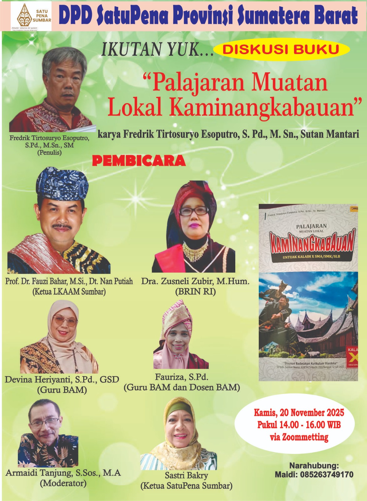 Demikian terungkap pada diskusi buku berjudul “Palajaran Muatan Lokal Kaminangkabauan” karya Fredrik Tirtosuryo Esoputro, S. Pd., M. Sn., Sutan Mantari, Kamis (20/11/2025) melalui zoom meeting.