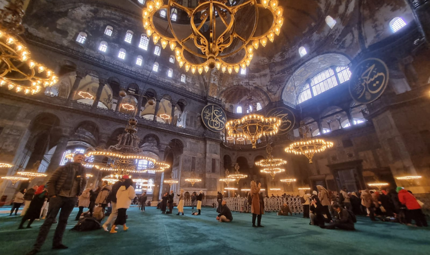 Hagia Sophia adalah gereja Kristen Ortodoks yang dibangun pada tahun 537 M oleh Kaisar Justinianus I. Saat itu, gereja ini adalah yang terbesar di dunia, menjadi pusat Kristen di Timur sekaligus simbol kekuasaan Bizantium. Setelah Konstantinopel dikuasai Ottoman pada 1453, gereja ini diubah menjadi masjid dengan penambahan kaligrafi dan unsur Islam, termasuk mihrab dan mimbar. Tahun 1930, saat Republik Turki berdiri, Hagia Sophia diubah menjadi museum oleh Mustafa Kemal Atatürk, untuk menegaskan identitas Turki sebagai negara modern dan sekuler. Seiring dinamika politik, pada 2020 pemerintah Turki mengembalikan fungsi Hagia Sophia sebagai masjid.
