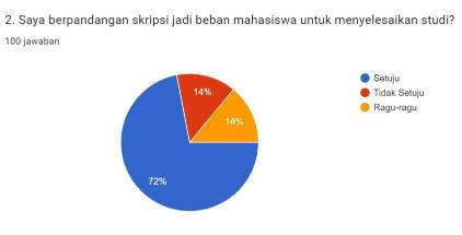 Nah, ketika mahasiswa dan alumni S1 ditanya, “pandangannya tentang skripsi sebagai beban untuk menyelesaikan studi?”. Maka responden menjawab, 72% setuju sebagai beban, 14% tidak setuju sebagai beban, dan 14% ragu-ragu. Survei yang dilakukan TBM Lentera Pustaka ini diisi oleh 100 mahasiswa dan alumni S1 pada 25-31 Agustus 2023.