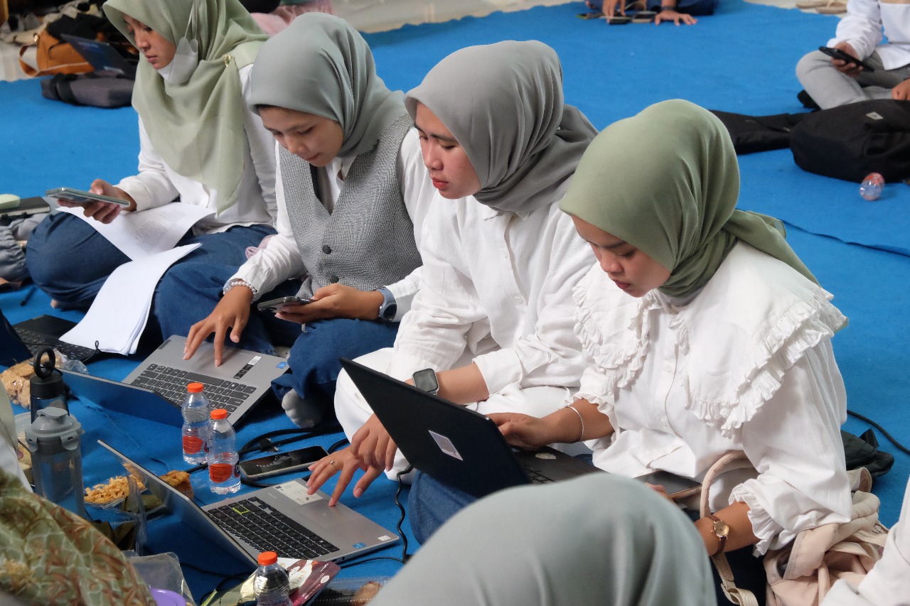 Para guru tampak antusias mencoba berbagai aplikasi berbasis AI yang dapat digunakan untuk membuat modul ajar, artikel opini, hingga presentasi interaktif berbentuk permainan edukatif.