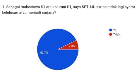 Sebagai pembuktian kebijakan baru tersebut, saya pun melalukan survei singkat kepada 50 mahasiswa semester 7 dan alumni S1 yang lulus dalam 3 tahun terakhir secara daring. Saat ditanya, sebagai mahasiswa S1 atau alumni S1, apakah Anda setuju skripsi tidak lagi jadi syarat kelulusan atau menjadi sarjana? Maka jawabnya, 93% setuju skripsi tidak lagi jadi syarat wajib kelulusan, hanya 7% yang menjawab tidak setuju.