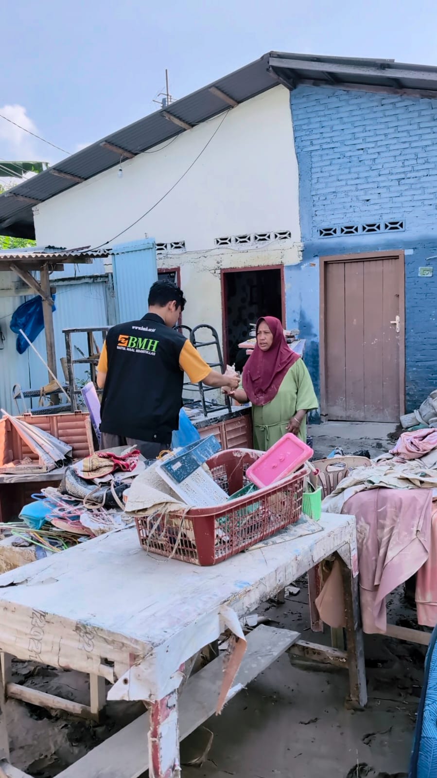 i Lokasi, armada BMH disambut oleh Ibu Puput sebagai Pengurrus Rumah Qur’an dan warga dengan wajah yang penuh sumringah, lalu suasana haru pun tergambar disana. Terlihat warga yang sibuk membersihkan rumah dan peralatannya yang terkena banjir dan lumpur, memberikan senyum tulus dan sambutan hangat ketika tim BMH datang.