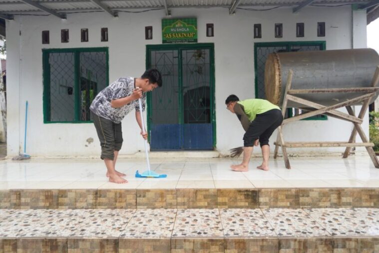 Aksi sosial ini diawali dengan kerja bakti membersihkan seluruh area mushala, mulai dari bagian dalam hingga halaman luar.