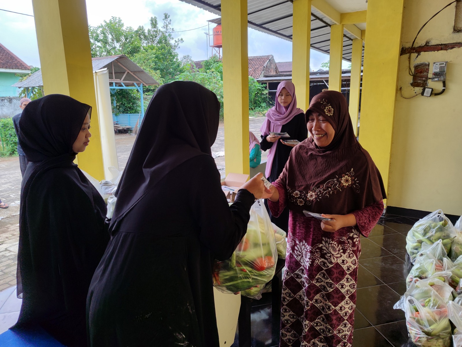 Para santri juga terlibat aktif. Mereka membantu membagikan sayuran dan berbaur dengan warga.
