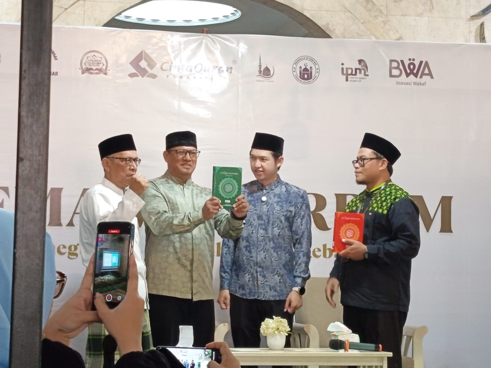 Simbolis tersebut menandai komitmen bersama untuk menyelenggarakan safari dakwah, serta distribusi dan pembinaan Al-Qur’an. Hadir mendampingi simbolis Al-Qur’an antara lain: Ketua Panitia, Bunda Alawiyah; Ketua SMS, Bunda Nur’aini; dan AM BWA Jawa Timur, Ustadz Slamet Sugianto. Acara berakhir jam 11.00 WIB sesuai rundown ditandai dengan foto bersama dengan Koh Dennis.