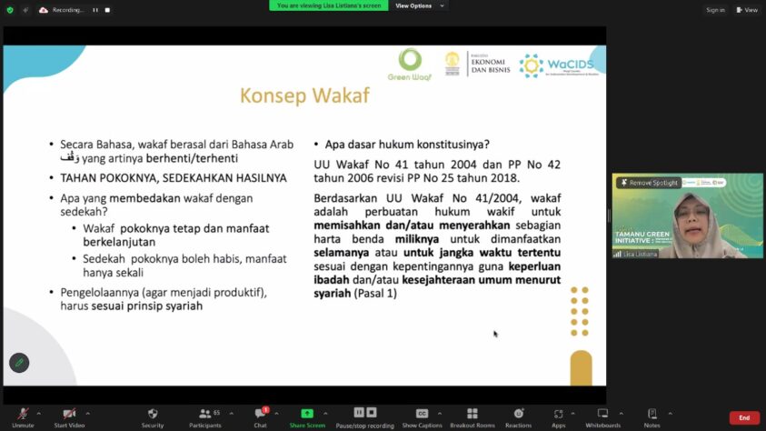 “Opsi keterlibatan nazhir dalam skema wakaf pada industri tamanu dapat berupa wakaf uang, wakaf melalui uang, bundling wakaf dan infak, serta 100% infak,” tutur Dr. Lisa Listiana selaku koordinator Gerakan Green Waqf dalam paparannya. Selain dapat menjadi salah satu pilihan dalam menjawab permasalahan lahan kritis Indonesia, aset wakaf bersifat kekal sehingga menjamin keberlanjutan pemanfaatan tamanu dari hulu ke hilir.