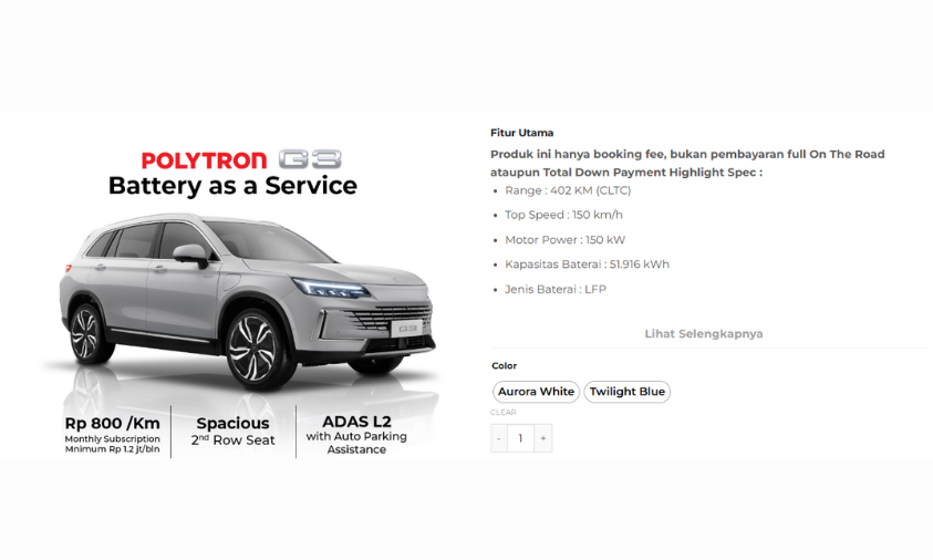 Polytron G3+ mengusung skema Battery-as-a-Service (BaaS), yaitu sistem penyewaan baterai yang bertujuan menurunkan biaya awal pembelian kendaraan. Dengan skema ini, Anda cukup membayar biaya sewa bulanan tanpa perlu khawatir akan biaya penggantian baterai di masa depan.
