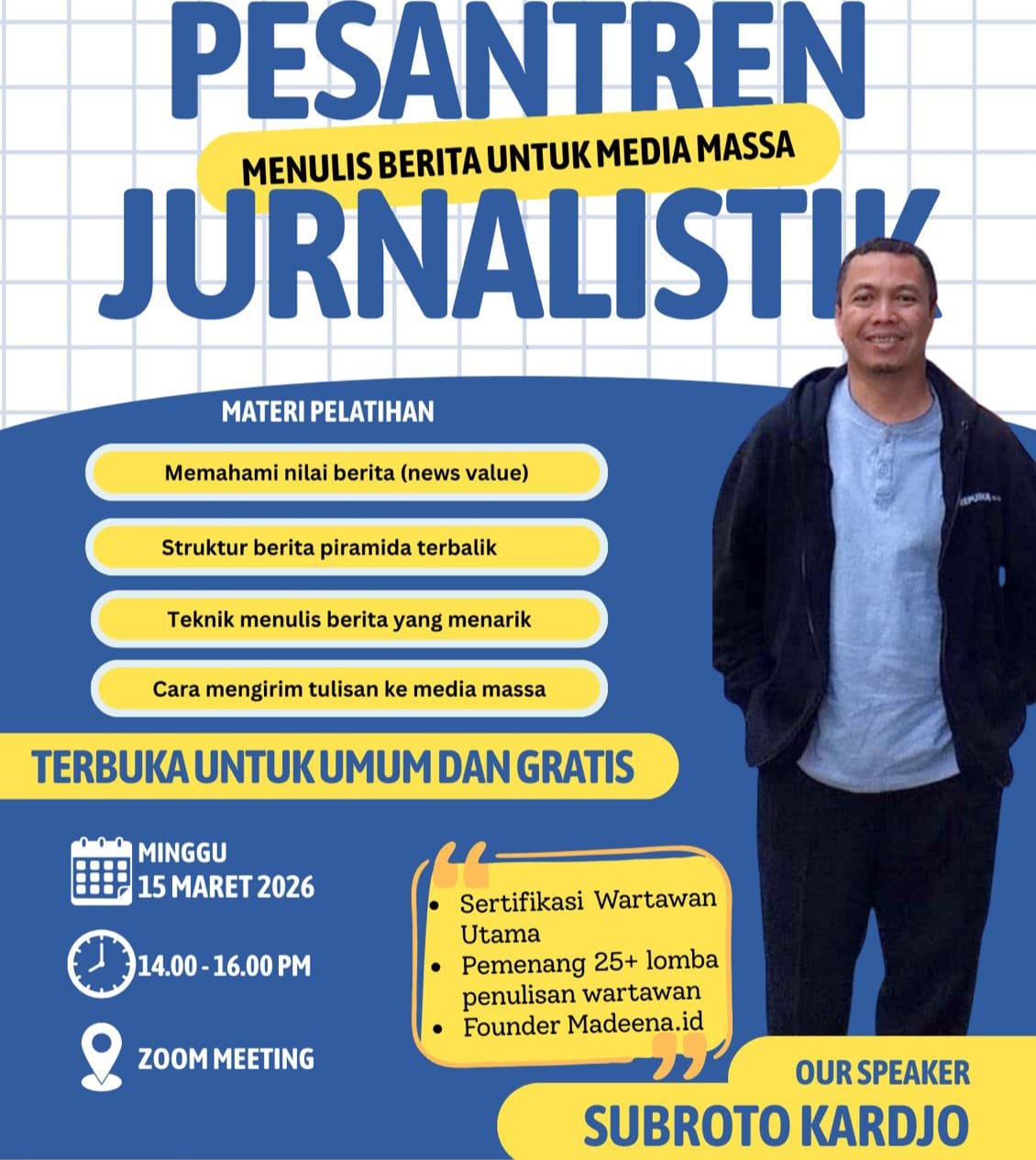 Tampil sebagai narasumber kegiatan ini wartawan senior Subroto Kardjo. Mantan Managing Editor Republika itu mempunyai pengalaman sebagai wartawan selama  lebih  dari 30 tahun dan memegang Sertifikasi Wartawan Utama dari Dewan Pers. Subroto Kardjo tercatat pernah memenangkan lebih dari 25 kali lomba penulisan wartawan. Dia juga adalah seorang trainer penulisan dan dosen komunikasi.