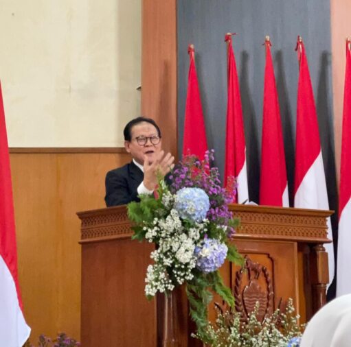 Milenianews.com, Kuningan—Guru Besar Fakultas Perikanan dan Kelautan – IPB University, Prof. Dr. Ir. Rokhmin Dahuri, MSc memberikan kata sambutan pada peringatan haji jadi Kabupaten Kuningan yang ke-526, di Kuningan, Ahad (1/9/2024).