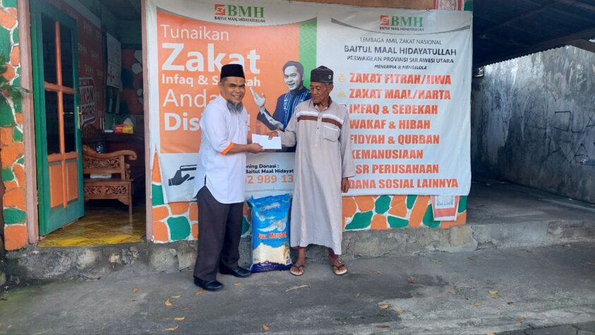 BMH Perwakilan Sulut menyerahkan bantuan beras kepada Pak Udin, Jumat (23/8/24). (Foto: Dok BMH)