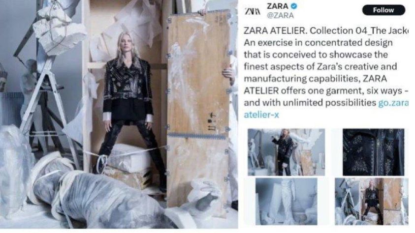 Model mengenakan studded jaket yang bernama The Jacket–produk perwujudan usaha untuk menampilkan craftmanship dan ekspresi artistik dalam lini Zara Atelier. Latar serba putih tersebut berisi properti yang terlihat sebagai cerminan situasi di Gaza.