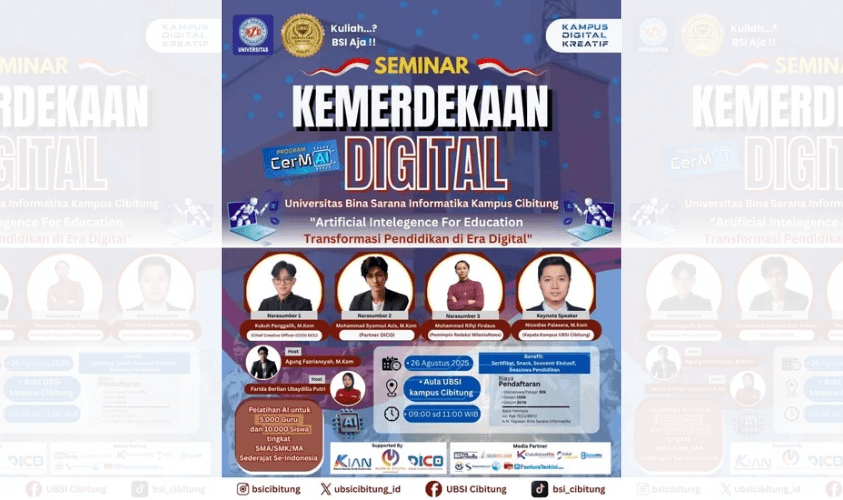 Untuk itu, mereka bakal ngadain Seminar Kemerdekaan Digital bertema “Artificial Intelligence for Education: Transformasi Pendidikan di Era Digital” pada Selasa, 26 Agustus 2025 pukul 09.00–11.00 WIB di Aula UBSI Kampus Cibitung.