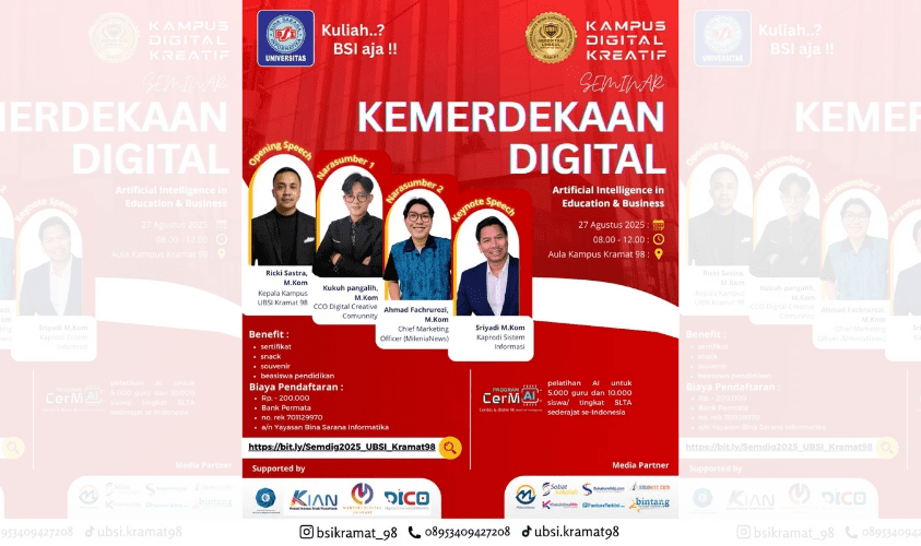 Untuk informasi lebih lanjut dan pendaftaran, peserta dapat mengakses link: https://bit.ly/Semdig2025_UBSI_Kramat98 atau melalui kontak Instagram: @bsikramat_98 dan WhatsApp: 0895340947208.
