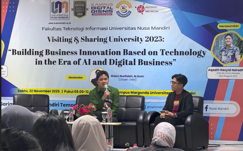 Milenianews.com, Depok – Universitas Nusa Mandiri (UNM) melalui Fakultas Teknologi Informasi (FTI) sukses menggelar Visiting & Sharing University 2025 bertajuk “Building Business Innovation Based on Technology in the Era of AI and Digital Business” pada Sabtu (22/11). Acara ini digelar secara hybrid, yaitu offline di UNM kampus Margonda dan online melalui Zoom.