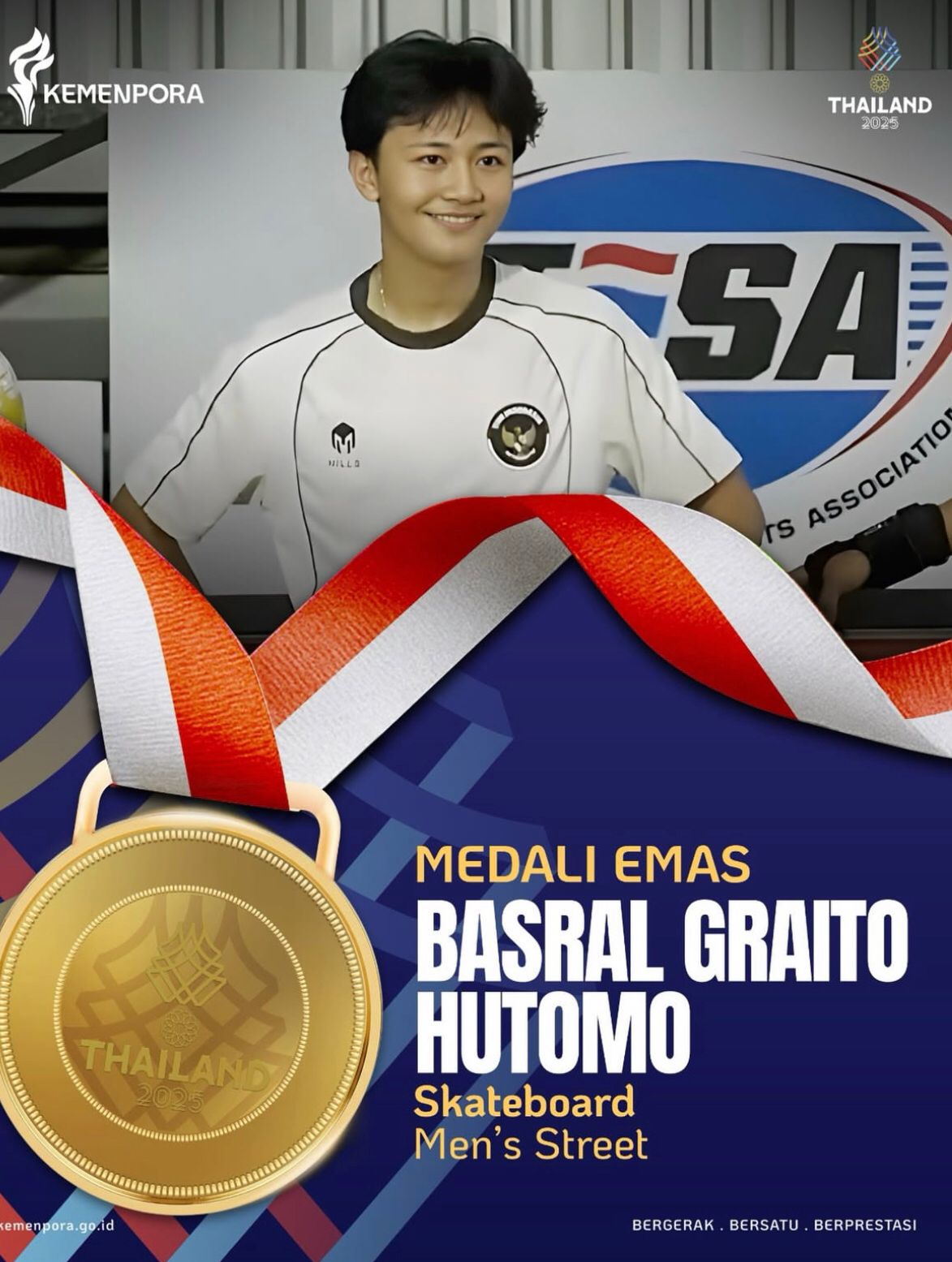 Milenianews.com – Di tengah sorotan lampu dan sorak para penonton di SAT Extreme Sports Park, seorang atlet muda dari Indonesia menorehkan satu babak bersejarah bagi dunia skateboard nasional. Basral Graito Hutomo berhasil mencuri perhatian saat ia mengangkat bendera Merah Putih di podium tertinggi nomor men’s street skateboard, pada ajang SEA Games 2025 yang digelar di Thailand.