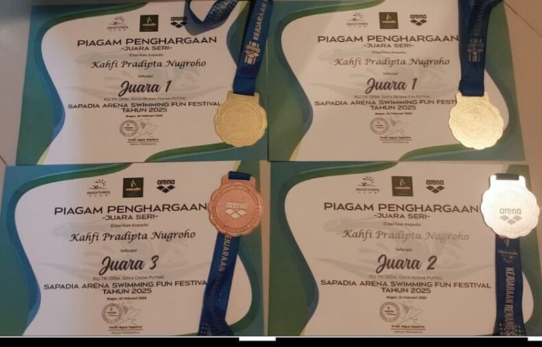 Ananda Kahfi Pradipta Nugroho, siswa TK B2 (Nymphea) berhasil meraih juara lomba renang tingkat sekolah/club yang berlokasi di daerah Parung Bogor, Kejuaraan Renang Sapadia Arena Swimming Fun Fastifal, pada  25 February 2025. (Foto: Dok PresGo)