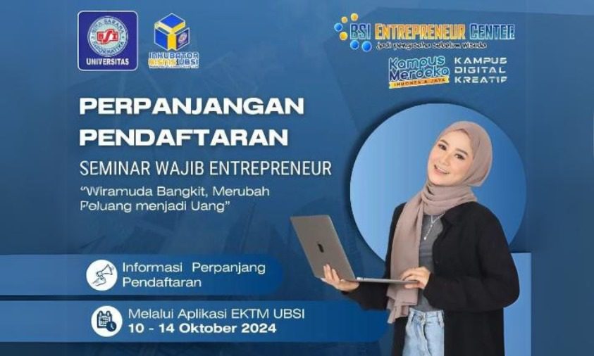 Milenianews.com, Karawang– Universitas BSI (Bina Sarana Informatika) Kampus Karawang melalui BSI Entrepreneur Center (BEC) dan Inkubator Bisnis BSI kembali akan menggelar seminar entrepreneur bertema “Wiramuda Bangkit, Merubah Peluang Menjadi Uang”. Kegiatan ini akan diselenggarakan secara luring di Aula Universitas BSI Kampus Karawang, Selasa, 15 Oktober 2024.