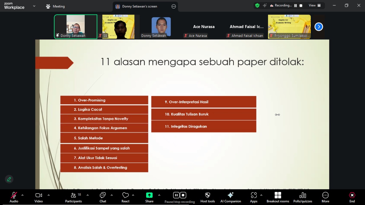 Sejak sesi dimulai, antusiasme peserta terasa kuat. Pendekatan yang digunakan pemateri jauh dari kesan monoton; justru sangat relevan dengan kebutuhan mahasiswa dan peneliti di era digital. Dengan gaya yang lugas dan bersahabat, Donny membuka wawasan peserta tentang realitas penulisan akademik: kecemasan ketika hendak submit artikel, alasan umum kenapa paper ditolak jurnal, hingga cara AI dapat menjadi co-pilot yang membantu, bukan menggantikan.