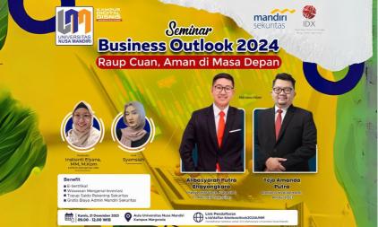 Seminar Business Outlook 2024 kerja sama dengan PT Mandiri Sekuritas dan PT Bursa Efek Indonesia dengan menghadirkan Alibasyarah Putra Bhayangkara, selaku Head of Branch Jakarta 2 PT Mandiri Sekuritas dan Teja Amanda Putra, selaku Market Development Analyst BEI.
