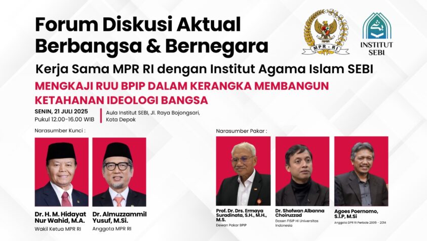 Milenianews.com, Depok– Institut SEBI berhasil menyelenggarakan kuliah umum bertajuk “Membangun Ketahanan Ideologi Generasi Muda demi Kemajuan Bangsa” di Aula Institut SEBI, Jl. Raya Bojongsari, Kota Depok. Acara yang diadakan pada Senin (21/7/2025), pukul 09.00-11.30 WIB ini menghadirkan dua tokoh nasional sebagai pembicara utama: Dr. H. Muhammad Hidayat Nurwahid, M.A. (Wakil Ketua MPR RI) dan Dr. Al Muzzammil Yusuf, M.Si. (Anggota DPR/MPR RI). Kuliah umum ini turut dihadiri oleh Sigit Pramono, Ph.D. (Rektor Institut SEBI) selaku tuan rumah.
