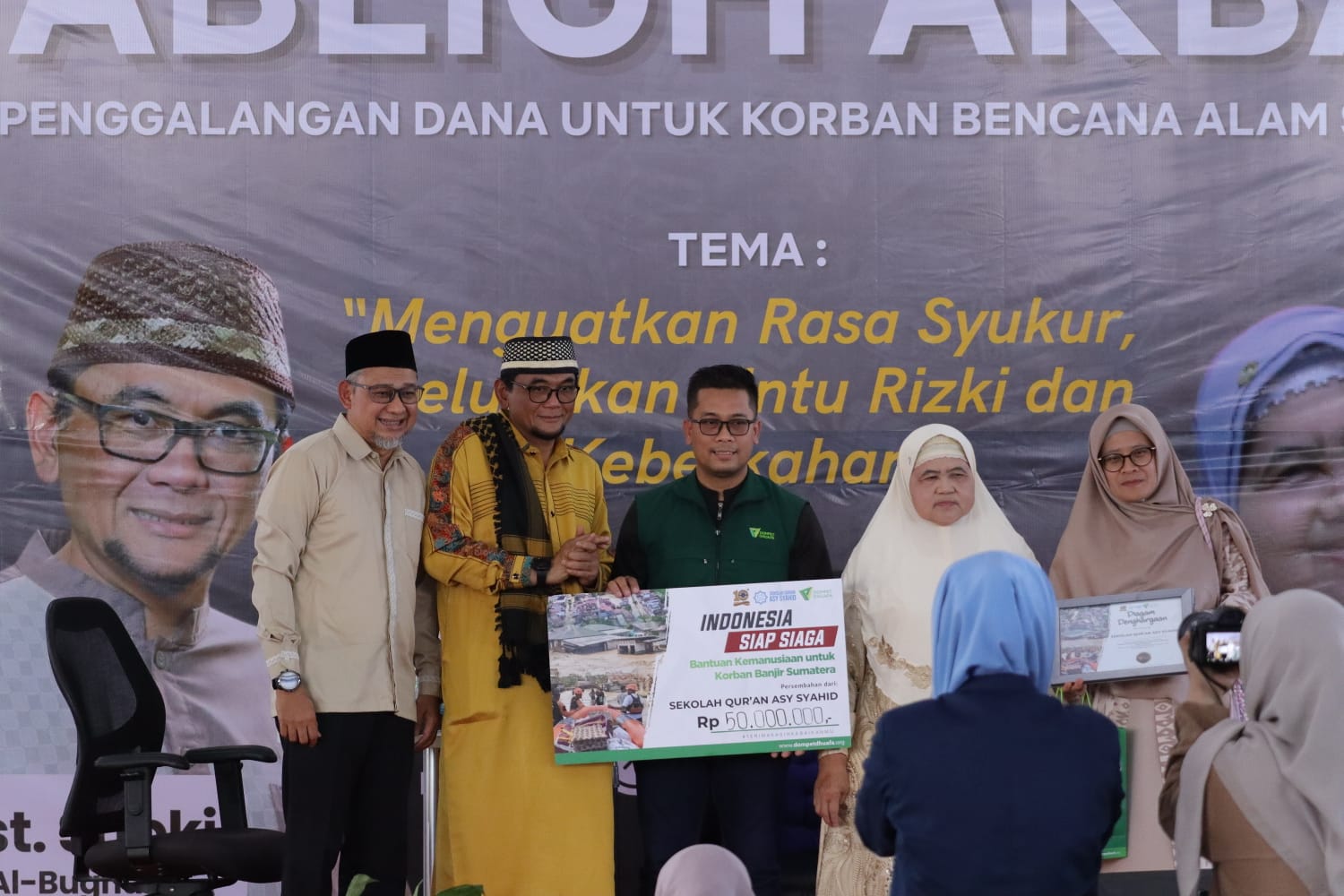 Dr. Rini Pura Kiran, M.Eng, direktur sekolah Quran Asy Syahid didampingi oleh pembina YPMC, Mamah Dedeh dan Ustadz Subki Al-Bughury menyerahkan donasi yang terkumpul kepada perwakilan lembaga kemanusiaan Dompet Dhuafa, sejumlah Rp 50 juta.