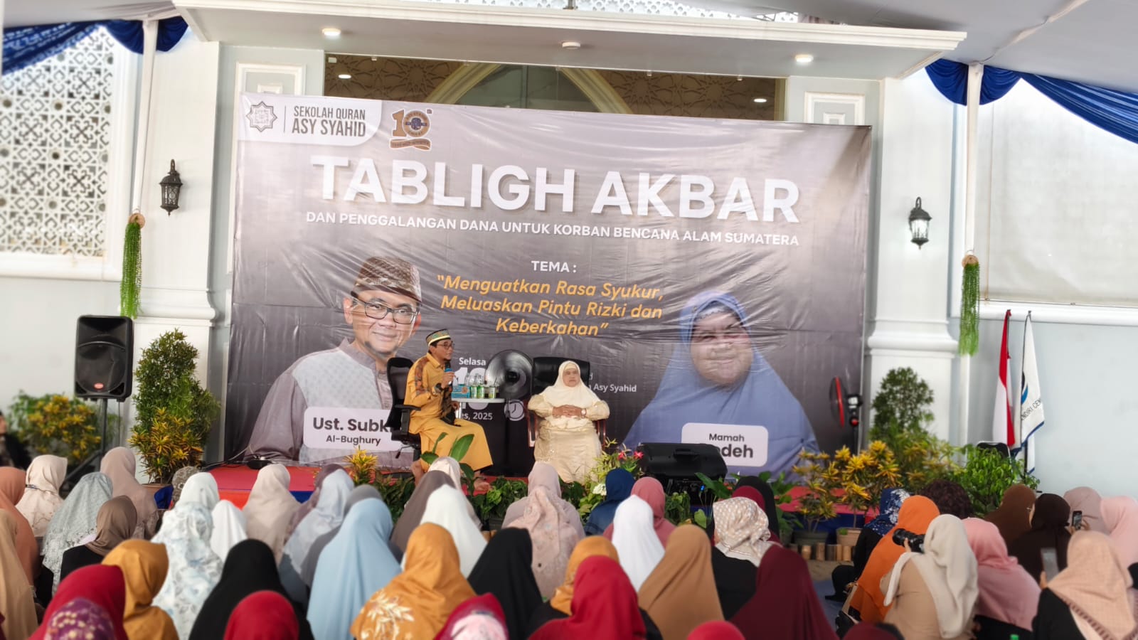 Pembina Yayasan Perkasa Mandiri Cemerlang (YPMC) yang menungi Sekolah Quran Asy Syahid, Dr. Candra Dermawan, M.Eng menyampaikan bahwa acara Tabligh Akbar ini dilaksanakan dalam rangka rangkaian peringatan satu dasawarsa Sekolah Quran Asy Syahid sebagai bentuk rasa syukur sekaligus kepedulian terhadap lingkungan masyarakat, khususnya dalam rangka meningkatkan ukhuwah serta memperkuat syiar agama Islam. “Sebelumnya Asy Syahid telah mengadakan kegiatan donor darah, Gebyar Anak Shaleh, dan Smart Run, lari bersama dengan beberapa katagori yang dikuti oleh masyarakat luas,” ujarnya.