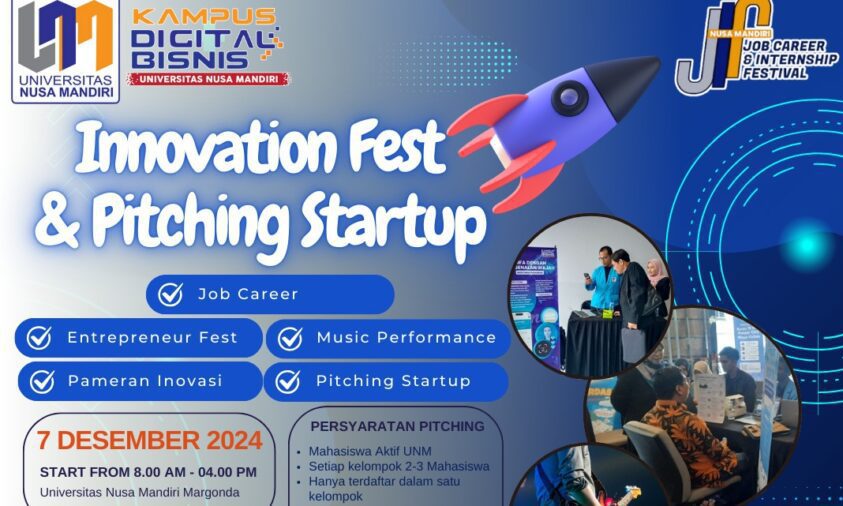 Milenianews.com, Jakarta– Nusa Mandiri Innovation Center (NIC) bersama Nusa Mandiri Startup Center akan menyelenggarakan kegiatan spektakuler bertajuk Innovation Festival dan Pitching Startup. Acara ini menjadi salah satu rangkaian unggulan dalam Job Career & Internship Festival (JIF) 2024 yang digagas oleh Nusa Mandiri Career Center (NCC). Kegiatan ini dijadwalkan berlangsung pada Sabtu, 7 Desember 2024, di Universitas Nusa Mandiri Kampus Margonda.