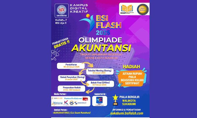 Salah satu sub lomba dari BSI Flash ini, di bawah naungan Prodi Sistem Informasi Akuntansi UBSI kampus Sukabumi, yakni Olimpiade Akuntansi. Rizal Amegia Saputra selaku Kaprodi Sistem Informasi Akuntansi UBSI kamus Sukabumi mengatakan, olimpiade ini berlangsung mulai 6 Januari hingga 3 Februari 2025.
