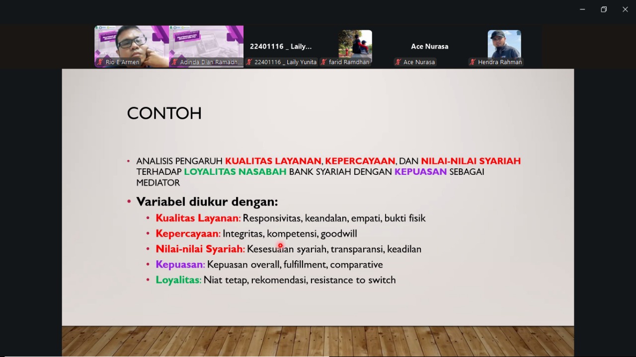 Pelatihan ini menghadirkan Prayogo P. Harto, S.E., Ak., CA., M.M., Dosen Tetap Akuntansi Syariah IAI SEBI, yang dikenal berpengalaman dalam bidang metodologi penelitian dan analisis data kuantitatif. Selama dua jam penuh melalui platform Zoom, peserta diajak memahami langkah-langkah analisis SEM-PLS menggunakan aplikasi SmartPLS — mulai dari konsep dasar, model struktural, hingga interpretasi hasil analisis.