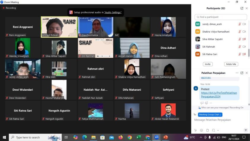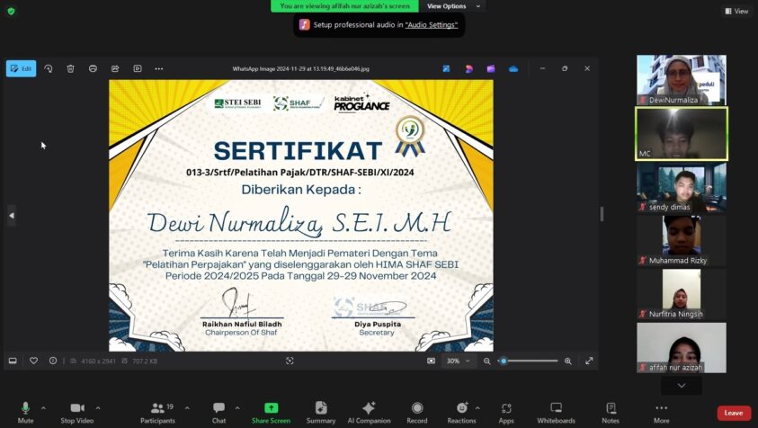 Milenianews.com, Depok– Pada Kamis dan Jumat, 28 dan 29 November 2024, Departemen Training dari Himpunan Mahasiswa Akuntansi Syariah, Sharia Accounting Family (SHAF) telah melaksanakan kegiatan pelatihan pajak individu dan badan. Acara dilakukan secara online melalui aplikasi Zoom.