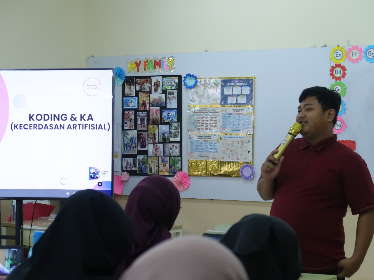 Pelatihan ini dibagi menjadi dua sesi. Pada sesi pertama, Wahyu menyampaikan materi koding, menjelaskan metode pembelajaran modern dan tujuan pengenalan koding dan AI dalam kurikulum. Guru diharapkan mampu berpikir komputasional, mengelola data, berkarya dengan rancangan inovatif, serta menjadi warga digital yang literat, produktif, dan beretika.