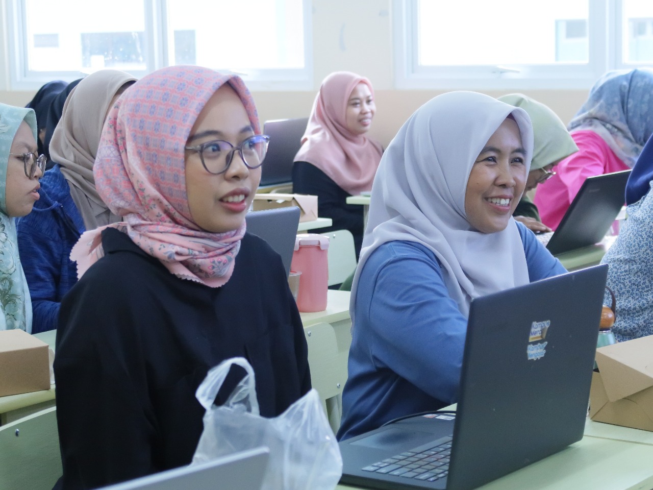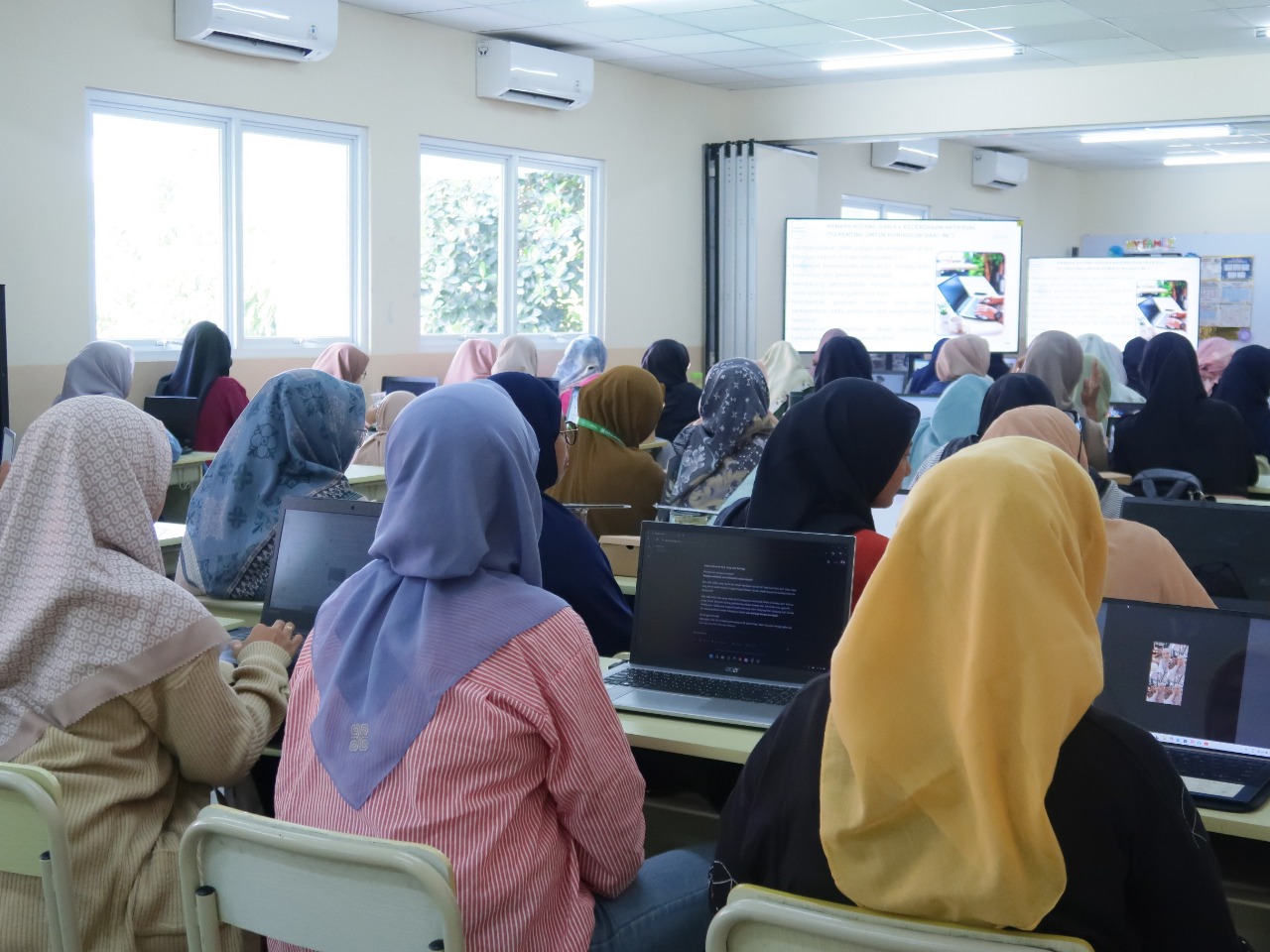 Suasana pelatihan berlangsung sangat antusias. Para guru tampak bersemangat saat mempraktikkan pembuatan materi ajar dan mengembangkan situs web pribadi.