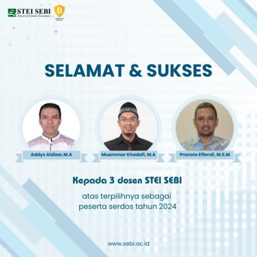 Firmansyah, SEI, MM, yang mewakili ketua STEI SEBI, menyampaikan ucapan selamat dan sukses kepada ketiga dosen tersebut: Addys Aldizar, Lc, M.A., Muammar Khadafi, M.A., dan Pranoto Effendi, B.E, M.S.M. Ketiga dosen ini resmi ditetapkan sebagai peserta Serdos 2024 oleh Kementerian Agama RI.
